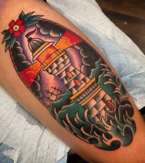Get detailed flash or custom art like this traditional color lighthouse tattoo with waves. Perfect for storytelling through body art.